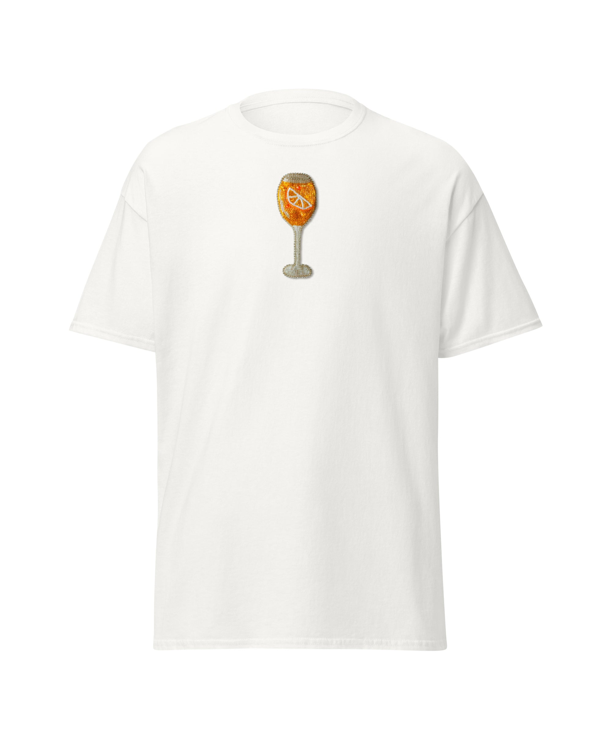 Hand-embroidered "Aperol Spritz" design created using seed beads, available for your own apparel or from my catalog. The pattern measures 12x4.5 cm (4.7x1.8 in) and takes me around 7 hours to complete.