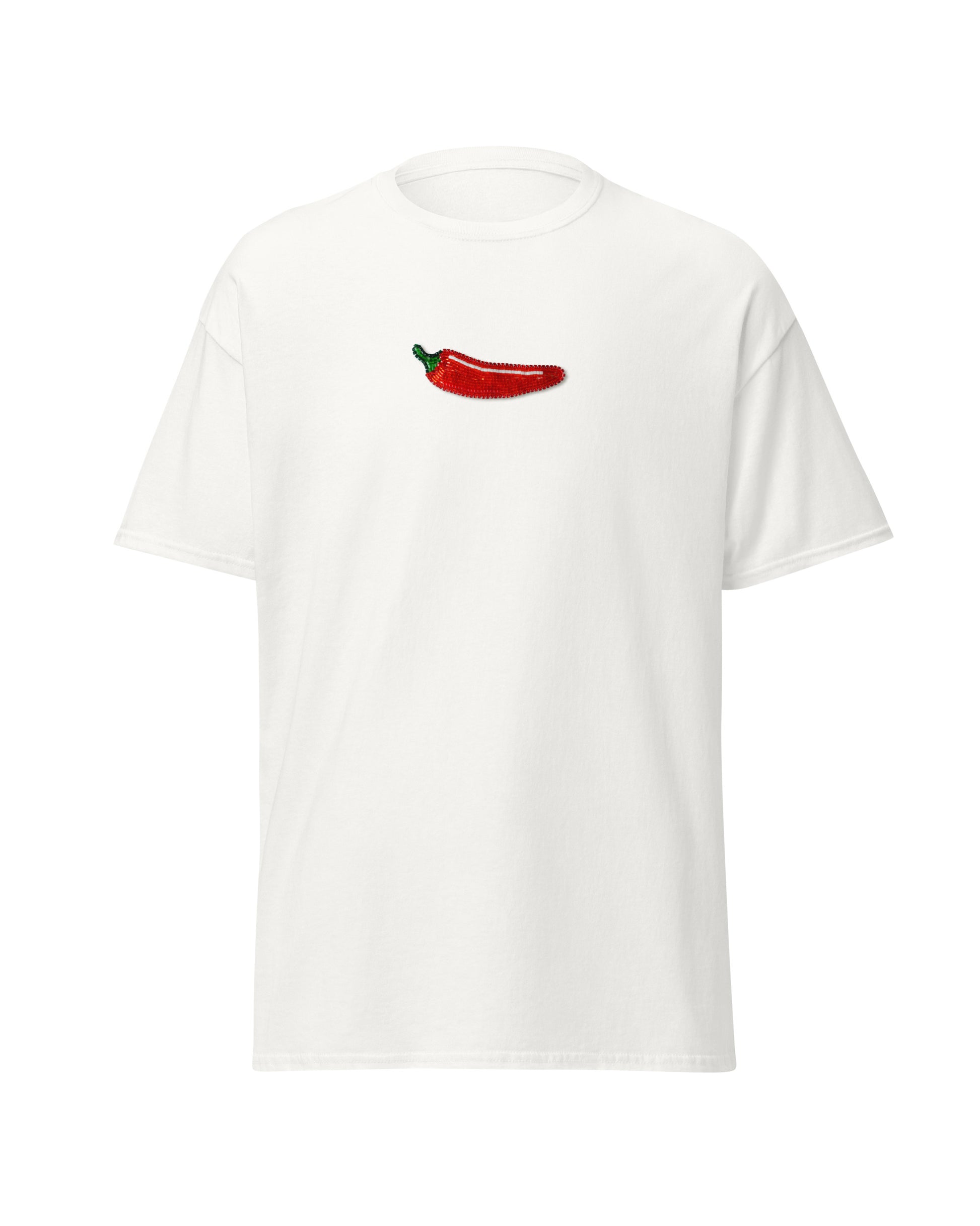 Hand-embroidered "Chili Pepper" design created using seed beads, available for your own apparel or from my catalog. The pattern measures 10x3 cm (3.9x1.1 in) and takes me around 6 hours to complete.